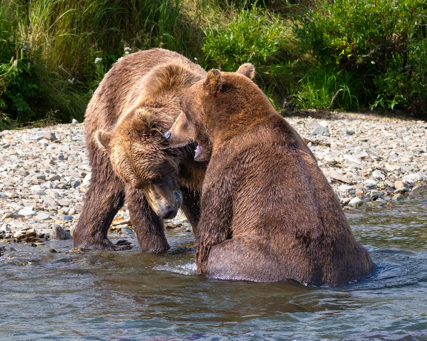 In August 2024, I was able get back to Katmai and to see the brothers again. This time they were in the (near, lookup on map) river play fighting and having fun. I have never actually seen them fishing, but they seem to be gaining weight, so I suppose they find the time, lol.