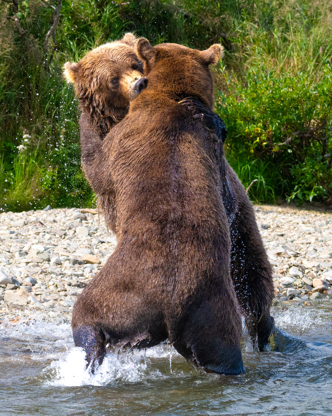 Typically grizzlies are solitary animals, even while fishing alongside each other amongst all the salmon! That is what makes these two male grizzlies a rare site. These siblings are about 5 years old based on info I’ve learned from the Katmai National Park Rangers. The rangers believe these two lost their mother when they were mature enough to take care of themselves, probably around 2 years old. So … they have stuck together now for about 3 years and when they aren’t fishing for salmon or sleeping, they are play fighting! They never actually bite one another seriously, which is pretty unusual.