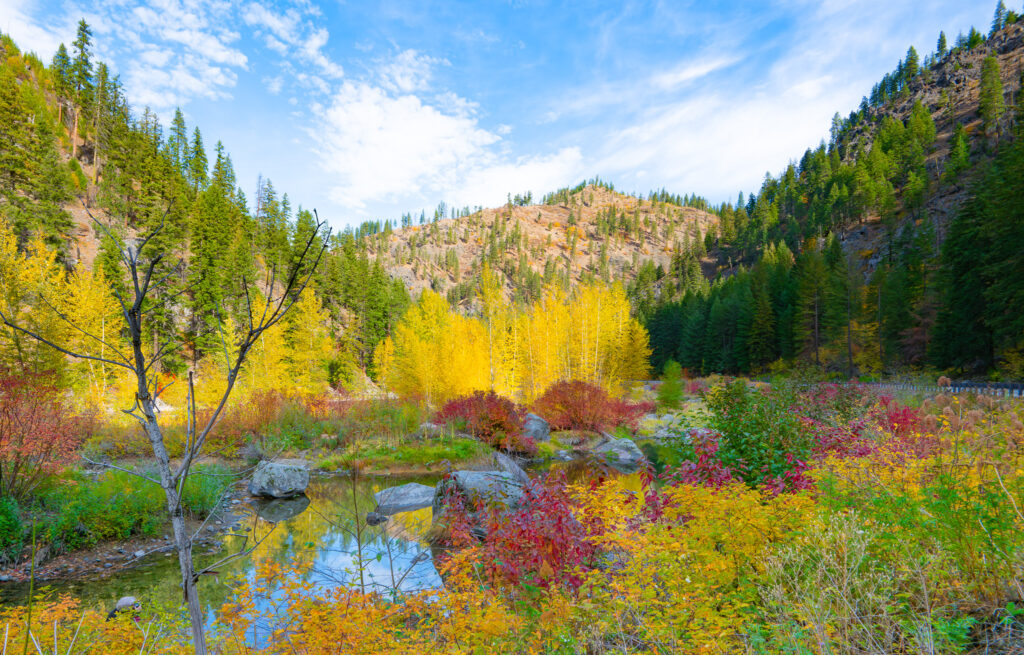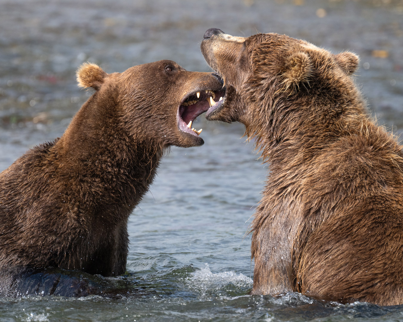 I first saw these two while I was photographing another male grizzly fishing in the river. While I was checking my shot, I saw these two guys in the background of the frame. While I waited for them to pop up again, they came into the river, not to fish but to play more! They kept play fighting as they crossed the river and disappeared into the brush.