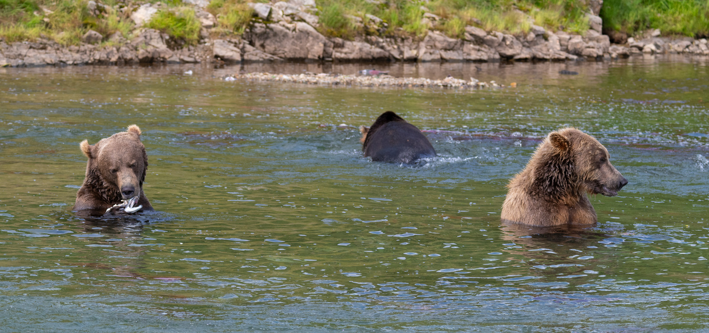 The thick vegetation surrounding the rivers is perfect for a bear den. While photographing a large male, fishing for salmon, I heard my guide call to me ‘Kevin, walk to me slowly’. I ALWAYS listen to my guides and in this case, it definitely kept me out of trouble! After I rejoined the group I looked back and saw how close I was to this mama and her cub. Big rush … but, I was able to get some great shots of this young mother. She was small and only had a single cub so I’m guessing she is about 3-4 years old.