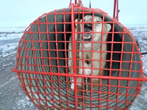 - The traps are baited with seal meat attached to a trigger mechanism. When a polar bear enters the trap and pulls on the bait, the door drops down, safely enclosing the bear inside the trap.