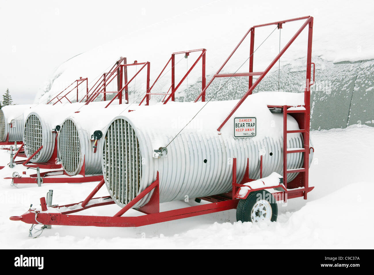 Polar bear traps are custom-built, live-holding devices crafted from large metal culverts mounted onto trailers. Each trap is designed with: