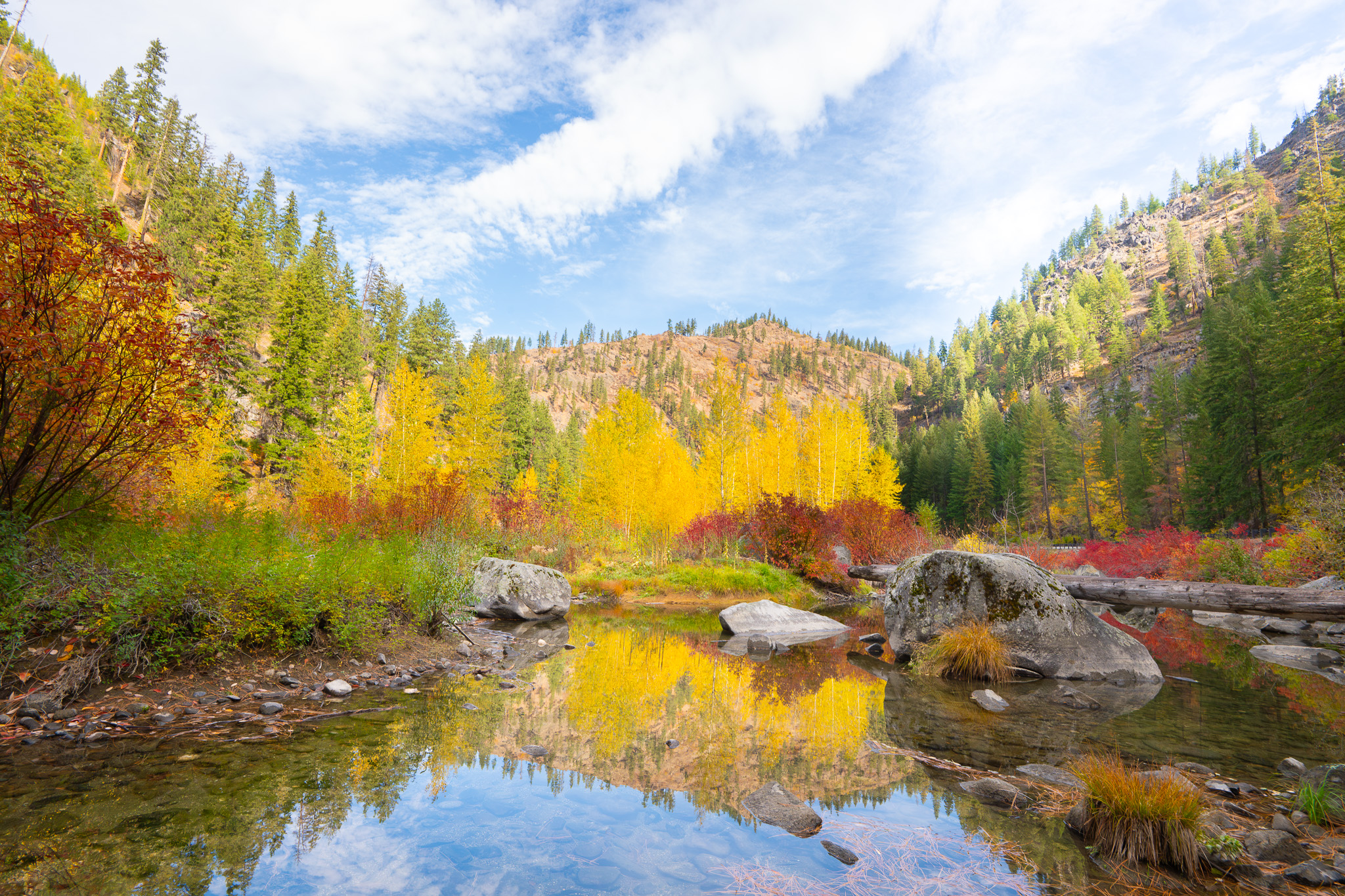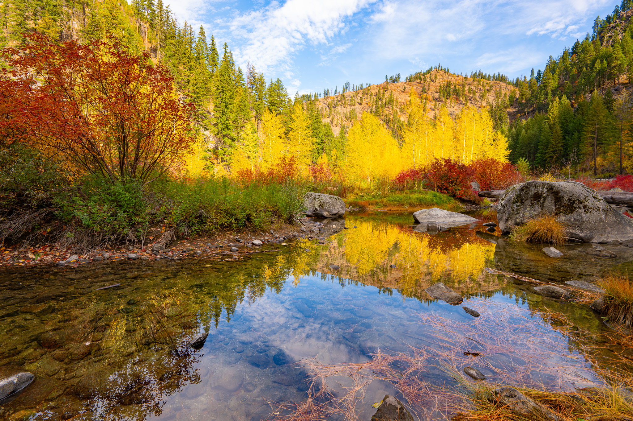 Tumwater Canyon near Leavenworth, WA, is simply breathtaking in October. It’s a time of year when the rushing Wenatchee River winds through steep granite walls lined with golden aspens and fiery red maples. The fall colors here are some of the most beautiful in the Pacific Northwest, creating endless opportunities for dynamic compositions that combine water, foliage, and rugged mountain backdrops. For photographers, it’s a dream location—perfect for practicing long exposures of flowing water, capturing vibrant reflections, or experimenting with wide-angle landscapes framed by brilliant autumn color.